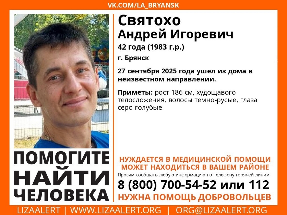 Ориентировка на без вести пропавшего Андрея Святохо появилась в группе Поисковый отряд «ЛизаАлерт» Брянской области ВКонтакте.