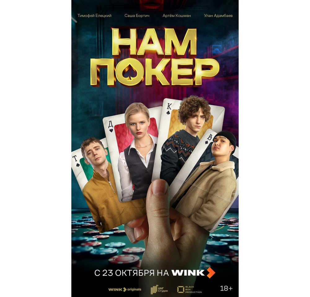 23 октября состоится премьера еще одного нового проекта линейки Wink Originals — криминальной комедии «Нам покер» (18+). Главные роли в проекте от режиссера Рустама Ильясова («Трудные подростки») о молодых людях, решивших заработать легкие деньги, исполняют Саша Бортич, Артем Кошман, Тимофей Елецкий, Улан Адамбаев, Сабина Ахмедова, Петр Скворцов и Даша Верещагина. Все началось с решения трех соседей по питерской квартире заработать денег: Витя, Ега и Бек открывают покерный клуб на дому. Игра в воротил подпольного бизнеса сперва кажется им забавной. Но вскоре один из клиентов демонстрирует корочку сотрудника ОБЭП и ставит их перед фактом — теперь они партнеры или их ждет тюрьма. Пацаны вынуждены расширять нелегальный бизнес, который из одного покерного стола в обычном многоквартирном доме, разрастается в подпольную игровую империю.