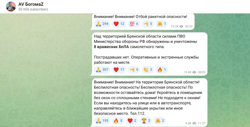 Между тем Александр Богомаз, во время действия беспилотной опасности, рассказал, что Министерство обороны силами ПВО сбило 13 беспилттников самолетного типа. К счастью, обошлось без жертв и пострадавших. На момент публикации беспилотная опасность длилась уже более двух часов.
