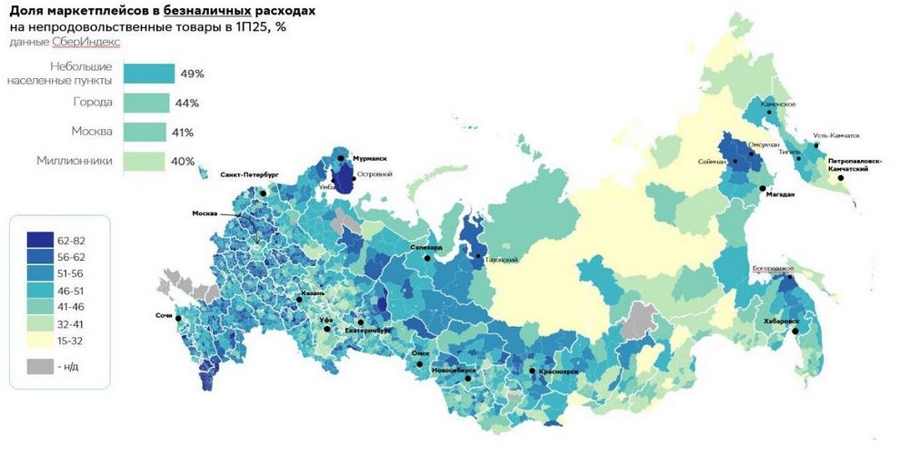 Ещё одна важная особенность российского рынка заключается в региональном различии доли маркетплейсов. В небольших населённых пунктах доля заказов через маркетплейсы существенно выше и достигает половины общего объёма потребительских расходов на непродовольственные товары. Чем больше город, тем ниже доля онлайн-заказов относительно общей массы потребителей. Так, Москва на общем фоне находится в более низкой части спектра. На графике ниже сравнение доли расходов на маркетплейсах в безналичных расходах граждан.