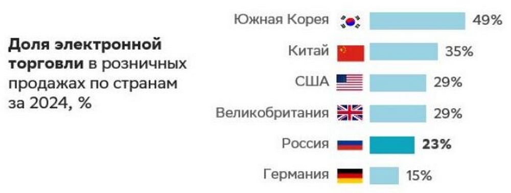 Однако рыночная ситуация значительно меняется из-за активного роста онлайн-торговли. По объёму доли электронной торговли в структуре розничного оборота Россия уверенно заняла пятое место в мировом рейтинге — 23%, обойдя Германию с её показателем 15%. Лидирует в этом рейтинге Южная Корея с впечатляющими 49%.