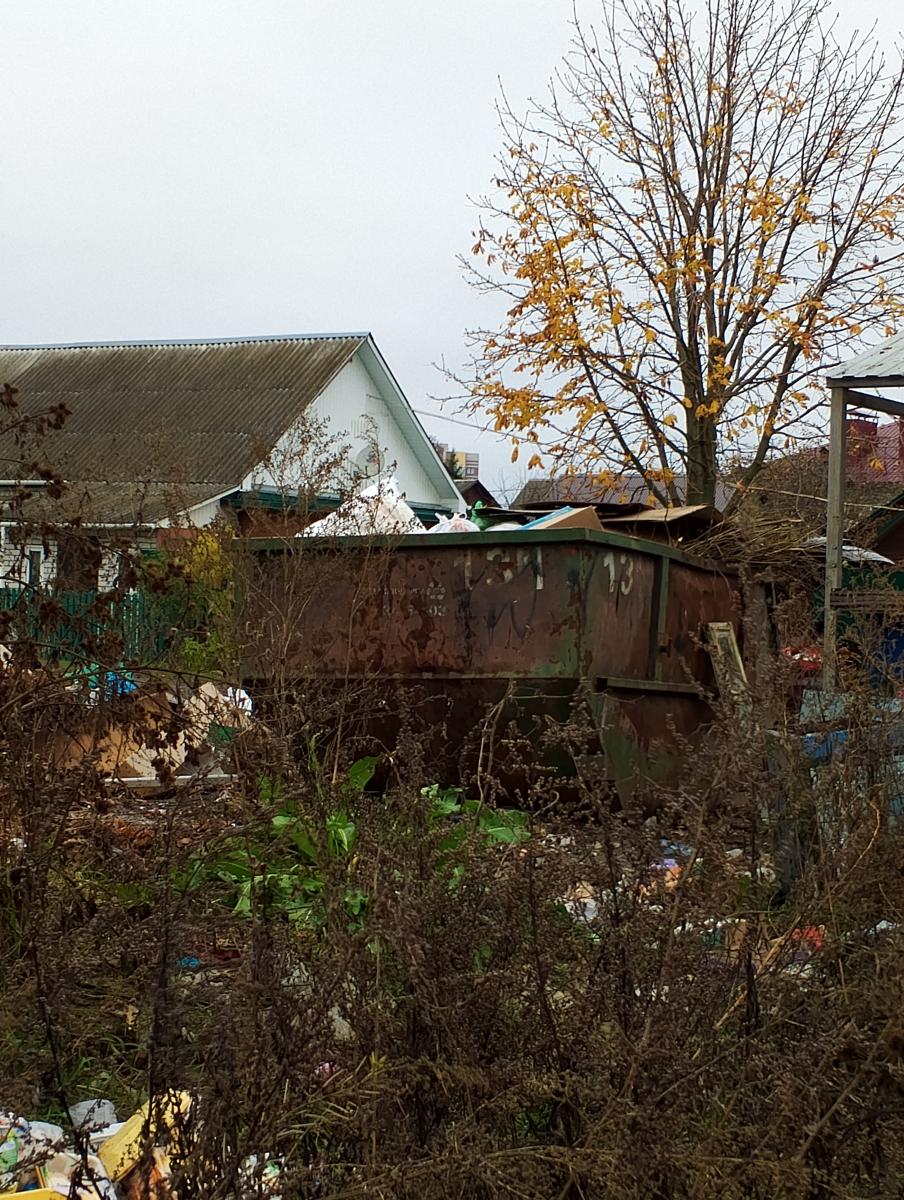 На этой фотографии, сделанной корреспондентом издания «Наш Брянск», можно заметить, что бак для твёрдых бытовых отходов действительно заржавел. Также видно, что возле него разбросан мусор. Сама ёмкость заполнена отходами: