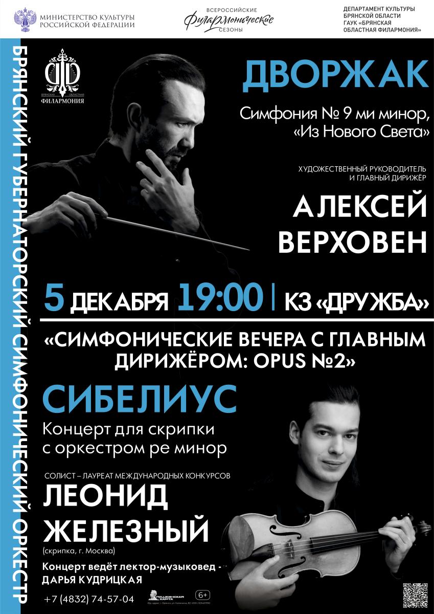 В программе вечера: Антонин Дворжак. Симфония № 9 ми минор «Из Нового Света» Ян Сибелиус. Концерт для скрипки с оркестром ре минор, op. 47 Солист — лауреат международных конкурсов Леонид Железный (скрипка).