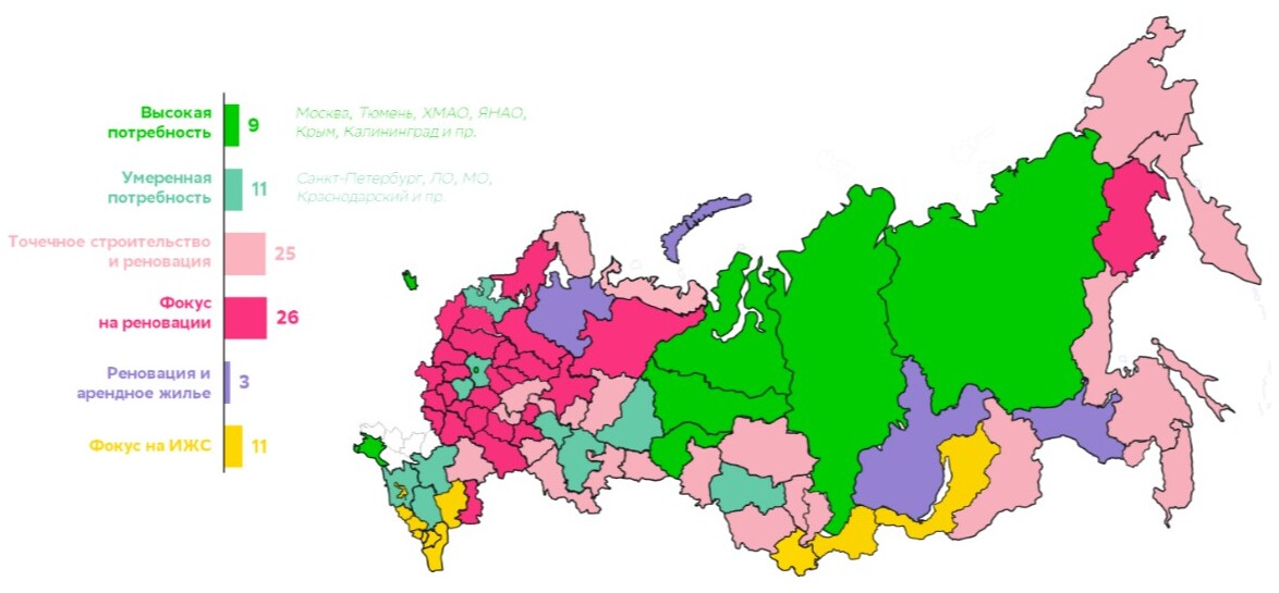 Ещё для 11 субъектов, включая Санкт-Петербург, Ленинградскую, Московскую области и Краснодарский край, характерна умеренная потребность в строительстве. Для 25 регионов может быть достаточно только точечного строительства и реновации существующего фонда. А в 26 субъектах, где население сокращается, а формальная обеспеченность метрами высокая, но фонд старый, основной фокус нужно направить на реновацию. В некоторых из них, например, в Архангельской, Иркутской и Амурской областях, где расположены крупные предприятия, требуется ещё и строительство арендного жилья для работников.