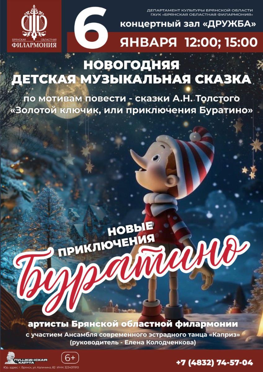 6 января в 12:00 и 15:00 в к/з «Дружба» Брянская областная филармония представит детскую новогоднюю музыкальную сказку «Новые приключения Буратино».