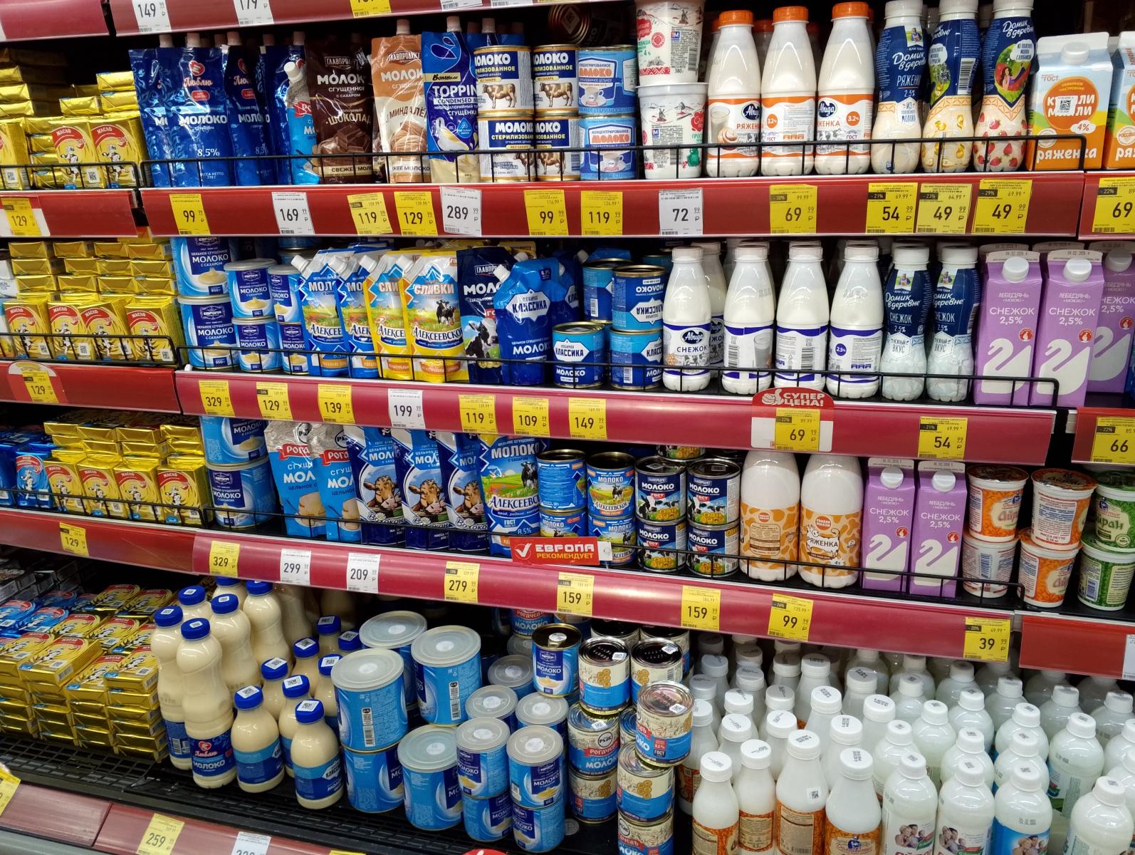 Литровая бутылка ряженки стоила от 99 рублей 99 копеек. За маленькую упаковку сгущённого молока придётся отдать минимум 109 рублей 99 копеек. Стандартная банка того же продукта предлагается за 159 рублей 99 копеек. 250 г ряженки можно взять по цене от 49 рублей 99 копеек.
