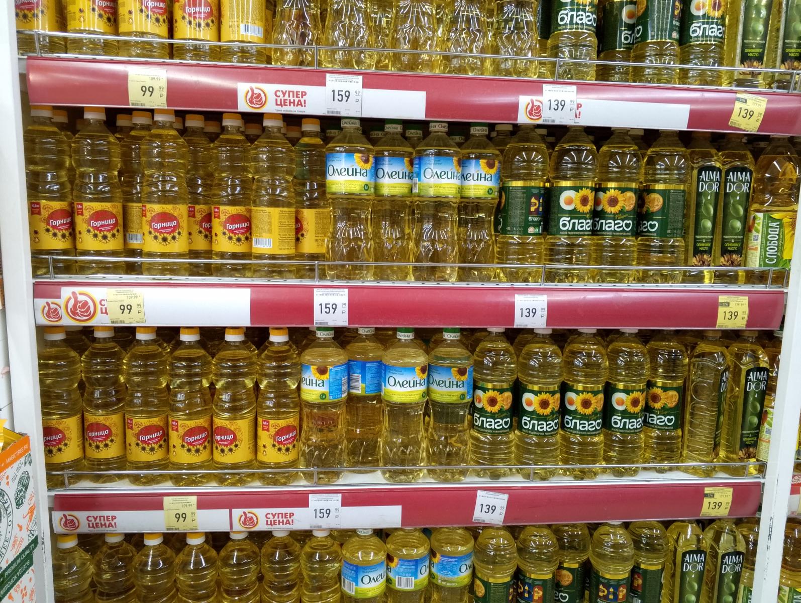 Также бутылка подсолнечного масла объёмом от 0,8 до 1 литра стоила от 99 рублей 99 копеек до 159 рублей 99 копеек.